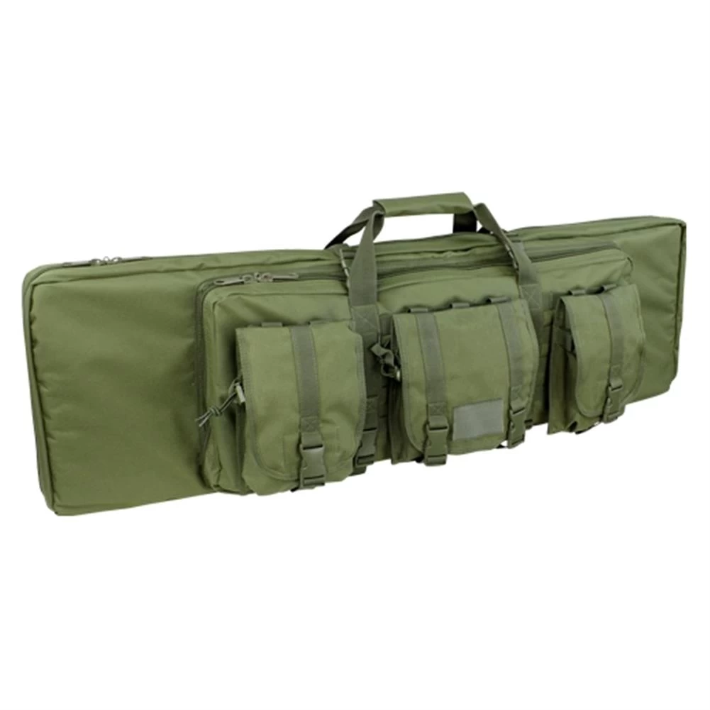 Transport two primary weapons at once with the Condor Double Rifle Case. The main compartment can hold two rifles and has padded sleeves at each end to secure the barrel and stock, while four hook and loop straps hold the firearms in place. A removable padded divider is included to provide ultimate organization capabilities and complete protection for the rifles. Three additional modular pouches are built in to accommodate up to 14 M4 magazines and can be removed or reconfigured as desired. The secondary zippered compartment is 26-inches long with two padded internal pockets with hook and loop closure to fit smaller weapons or other accessories.