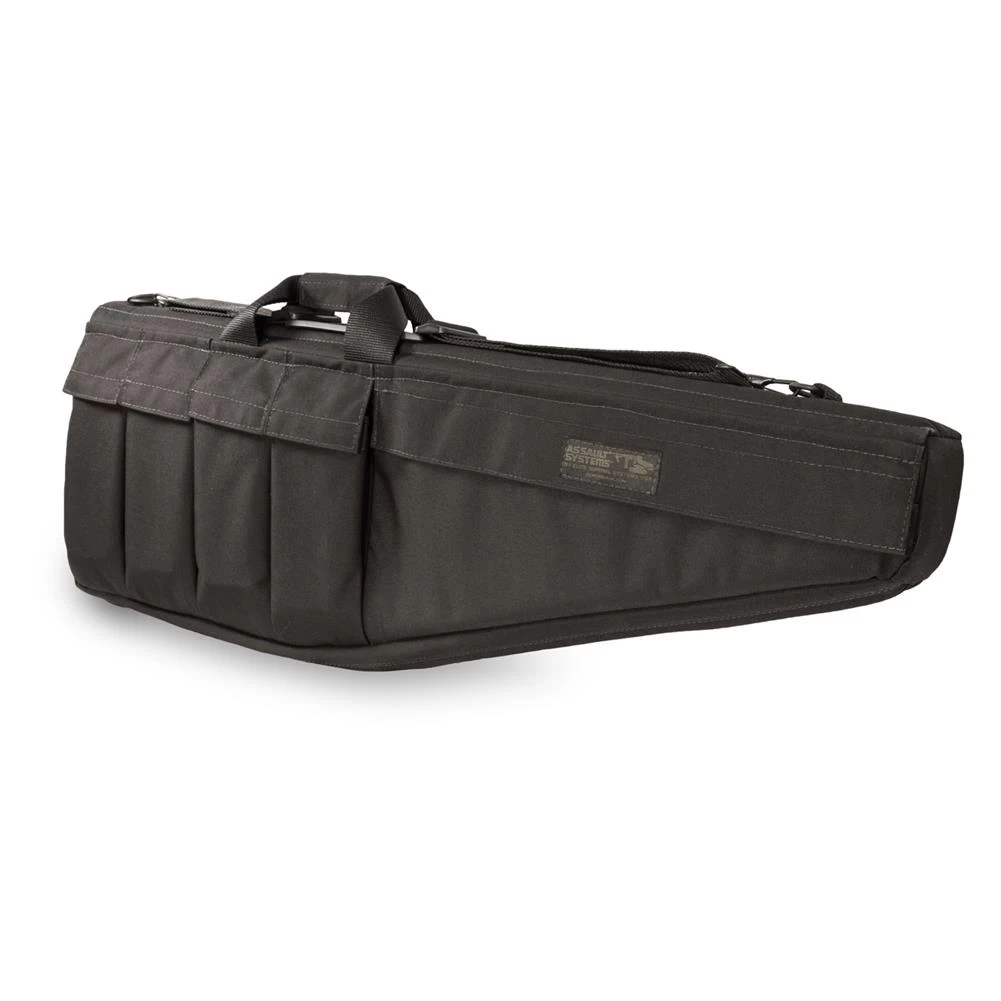 The original Assault Systems(TM) rifle cases are built to last in the USA. They are constructed of padded 1000 denier nylon with full-length heavy-duty zippers and hardware. They have welded steel D rings and come with a 2″ shoulder strap. They have up to six external magazine pouches, plus an accessory pocket. They are available in nine sizes to fit guns with overall lengths of 28″ to 48″