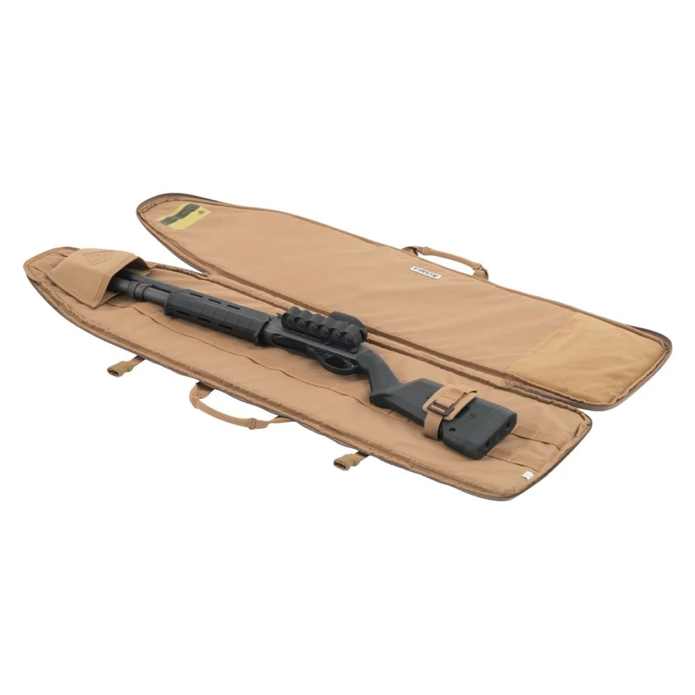 Designed to carry and protect your 42” rifle. With durable 500D nylon exterior and 10mm closed cell foam for padding, you can be confident in your firearm’s care. Straps are silent locking, and carrying handles are padded and reinforced. First Tactical’s Thru System hanging hooks, hook/loop interior mounting platform, and compression molded barrel mount complete this functional, protective, and innovative rifle sleeve.